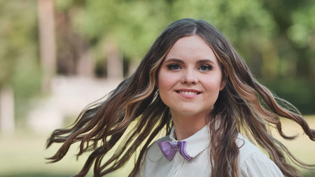 Look of a beautiful young confident girl. Summer park in the background.