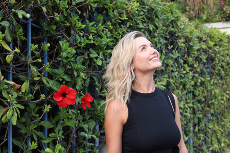 Beautiful woman near hibiscus plants with green leaves and red flowers outdoors