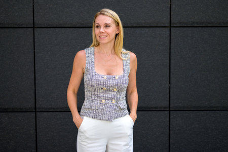 Blonde woman smiling confidently while standing in front of a modern dark wall with her hands in her pockets.