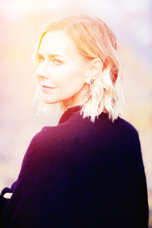 beautiful blonde woman looking at camera dressed in black at sunset
