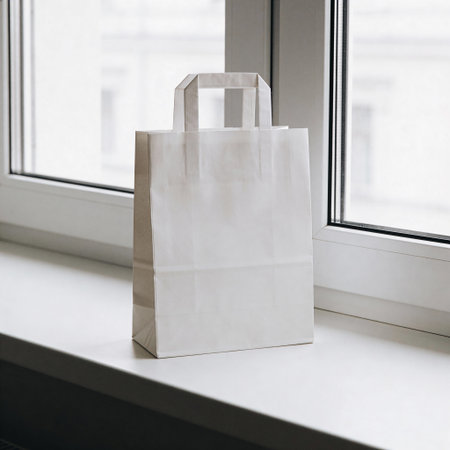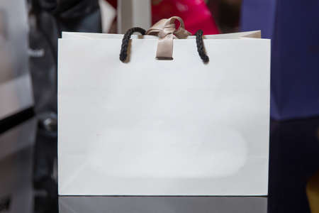White paper shopping bag on the windowsill, mockup, copy space