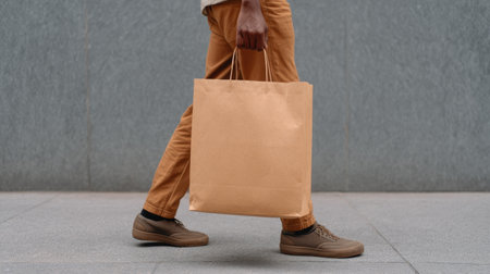 A person strolls along a city street, holding a brown paper shopping bag, showcasing casual footwear. The scene captures urban lifestyle and modern shopping.