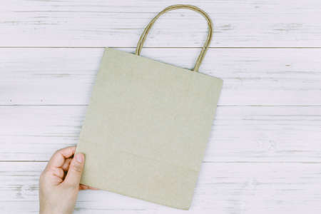 Hand holding shopping bag on wooden background