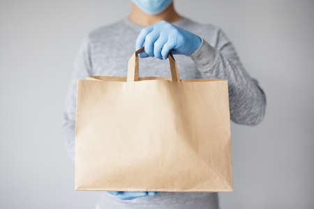 coronavirus concept - courier or food delivery man in medical mask and gloves holding paper package over white background