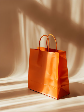Orange shopping bag on a light background with sunlight and shadows
