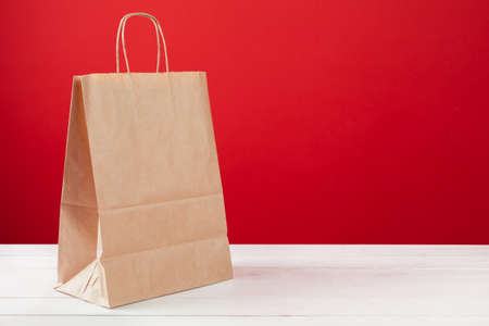 Paper shopping bag on wooden background