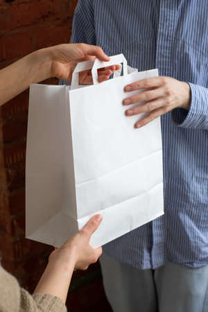 Courier taking off paper bag with food