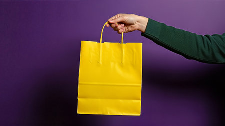 A persons hand holds a yellow paper shopping bag against a purple background
