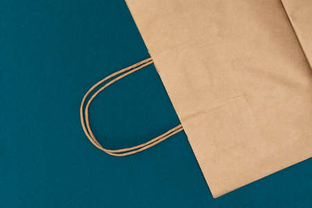craft paper shopping bag on blue background. store sale and consumerism. empty space concept.