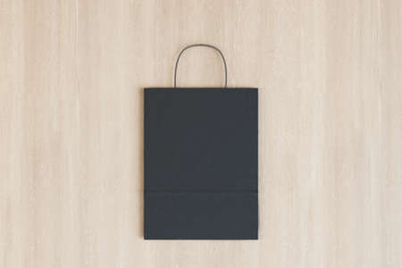 Close up of empty black paper bag on wooden background. shopping concept. Mockup, 3D Rendering