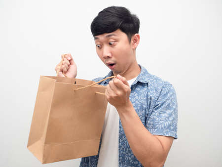 Man blue shirt open shopping bag feel shocked amazed emotion
