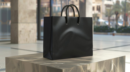 In this rendering, a blank black shopping bag with nylon rope handle hangs on a marble stone square column