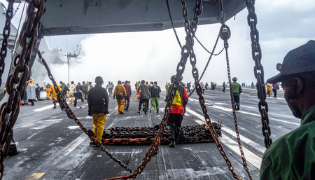 A team of maritime workers in safety gear coordinates on the expansive deck of a large vessel. Heavy anchor chains frame the scene, emphasizing the industrial scale of the operation as they prepare for transport or loading, showcasing teamwork and the backbone of global logistics.
