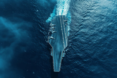 Aerial View of a Modern Navy Aircraft Carrier at Sea, Ocean Power Projection and Military Might