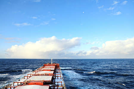 Cargo ship navigating through calm seas empty deck room for text