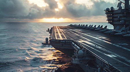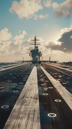 Close-up on the deck of an aircraft carrier, detailed with clear sky above for messages