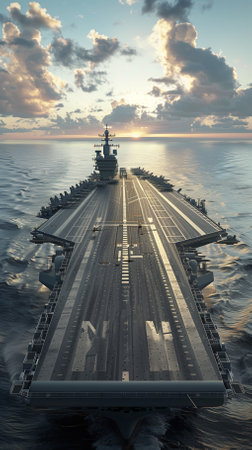 An impressive aircraft carrier rests in a vibrant harbor, its deck glinting in the warm light of evening.