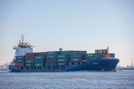 Hoek van Holland, the Netherlands - January 20 2019: cargo shipping container vessel mirror sailing out of port Rotterdam past Hoek van Holland and Maasvlakte harbour