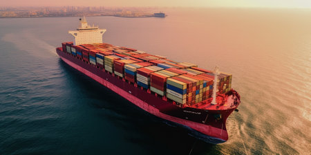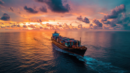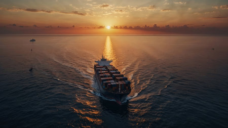 Cargo ship, drenched in sunset hues, navigates through calm ocean waters