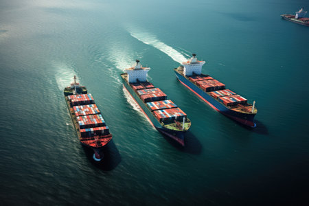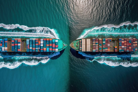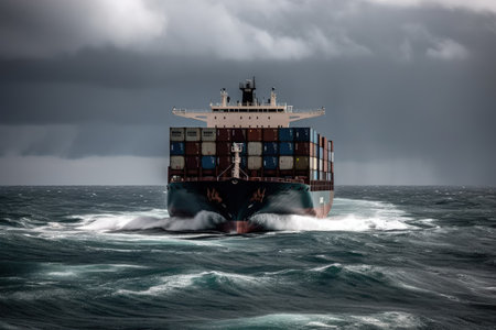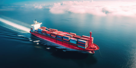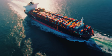 Generative AI, container ship in import export and business logistics. Aerial view, water transport, cargo shipping in open sea.
