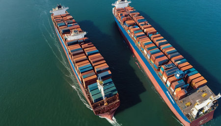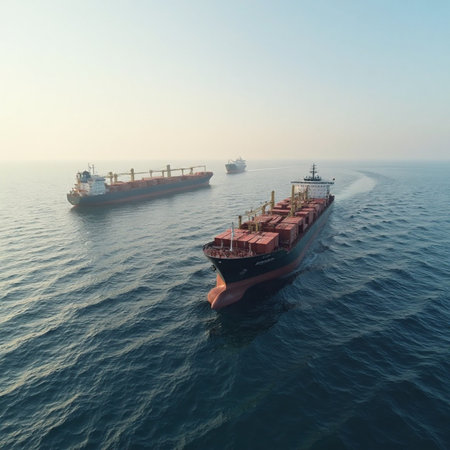 Several cargo ships sail on the ocean, transporting containers in calm waters under a hazy sky Perfect for logistics and shipping industry visuals.