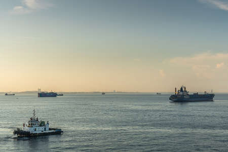 Makassar, Sulawesi, Indonesia - February 28, 2019: Tanto Bersatu container ship, Kalla Lines mix cargo ship and Numbay tugboat sail on blue Flores sea off the port of Makassar early morning.