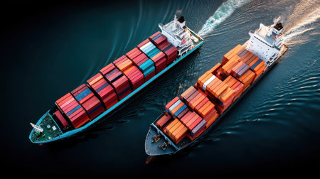 A Cargo ships carrying colorful containers symbolize trade war between USA and China on open sea