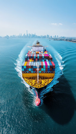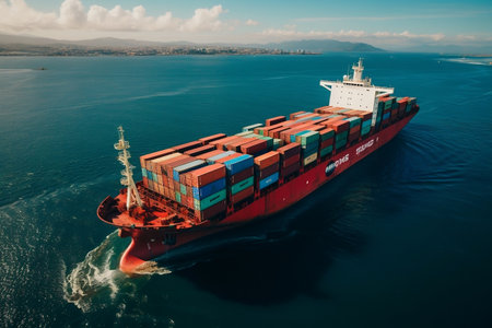 A large cargo ship laden with vibrant containers sails through calm blue waters, showcasing a busy maritime transport scene under bright daylight.