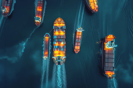 A fleet of cargo ships illuminated by electric blue automotive lighting floats in the dark ocean, resembling a futuristic scene from a spaceage engineering movie