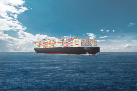 International cargo transportation in containers by sea. Sea huge ship with containers in the sea. mixed media. The concept of transport, logistics, delivery, business, globalization