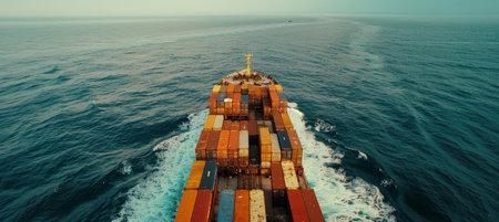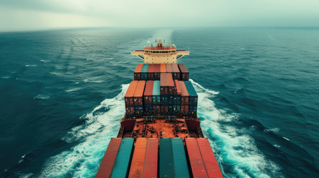 Back view of a large container cargo ship travels in the ocean. Generative AI image.