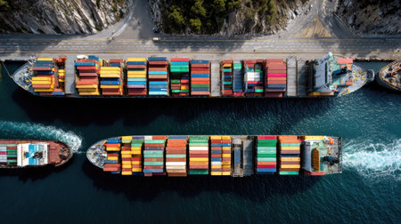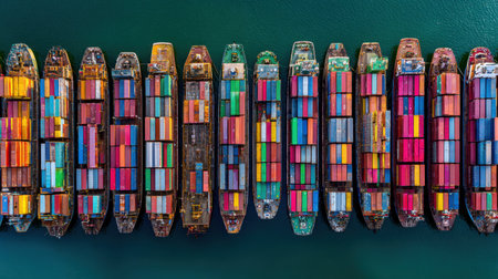 An aerial view showcasing colorful container ships docked at a busy port, highlighting the vital role of the shipping industry in global trade and logistics.