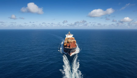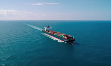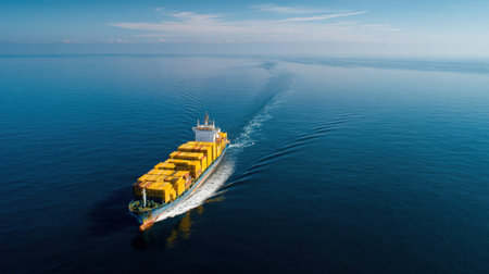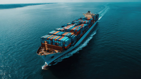 An overhead shot of a massive cargo ship navigating through deep blue waters, with containers neatly stacked on deck and the open sea stretching out to the horizon.