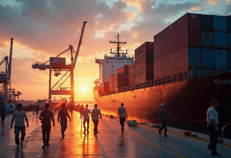 As the sun sets over the harbor, silhouettes of workers walk along the dock beside a cargo ship.