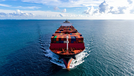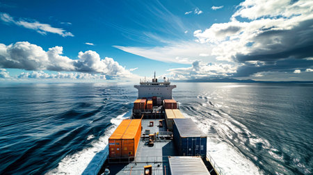 A large cargo ship moves swiftly through the ocean, leaving a wake in the sparkling water. The deck is filled with colorful shipping containers, reflecting a busy trade environment.
