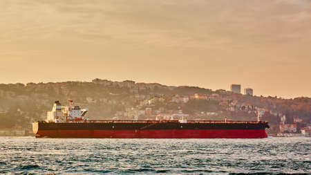 Cargo ship tanker in Bosphorus Strait about to pass under Bosphorus bridge
