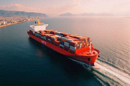 A large container ship moves steadily across tranquil waters, showcasing its vibrant orange color and stacked cargo containers as it plies the coastline.