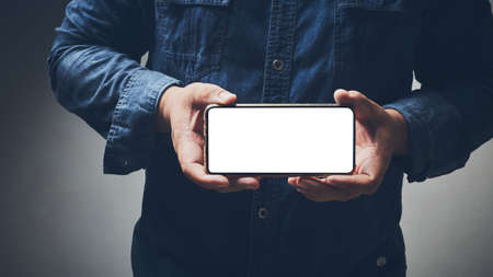 panoramic crop of delivery man holding smartphone with blank screen and carton box