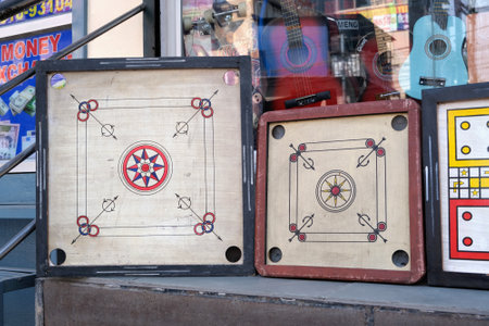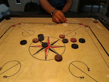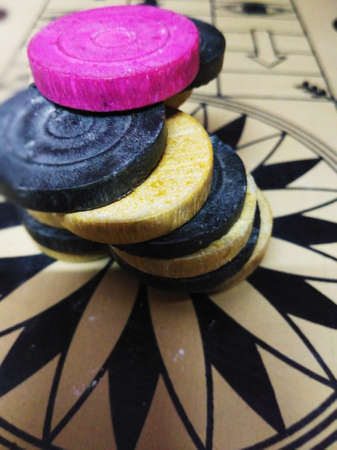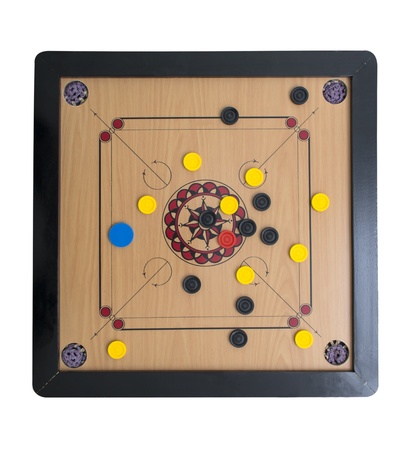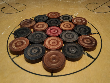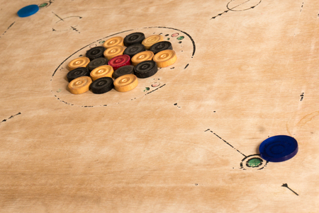 Carrom men arranged on the board for a game. This is a very popular table game played in India and east asia