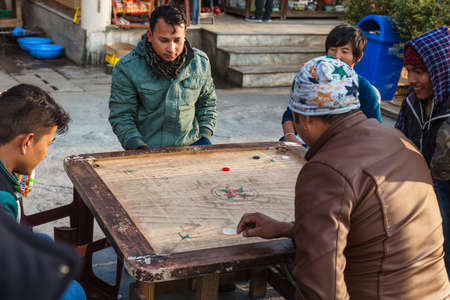 Nepal Pokhara to Himalayas Poon Hill Trekking Villagers playing board games in a mountain town.