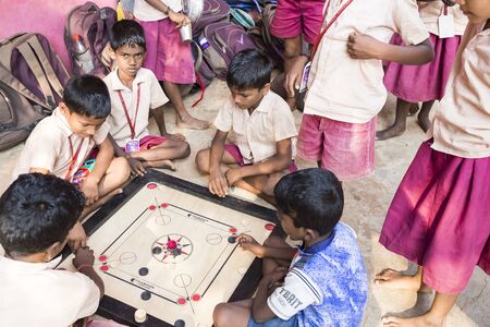 PUDUCHERY, INDIA - MARCH Circa, 2018 : Unidentified boys and girls at school playing with new carrom in playground outdoor. Smiling, happy, excited, funny, excited proud faces. Emotions and feelings.