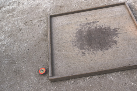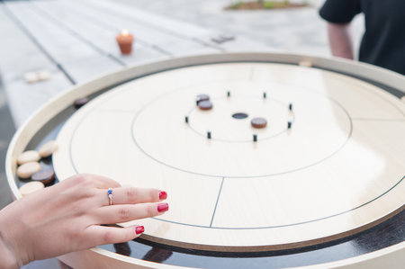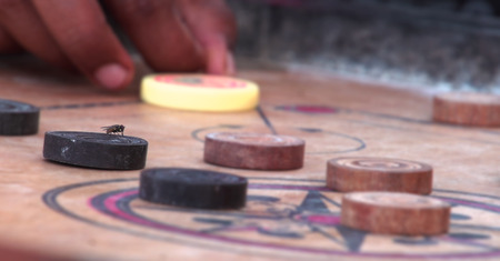 Carrom striker poised for hitting the black and white men. Carrom is a very popular game played in the indian subcontinent.