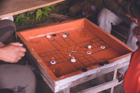 People playing Carrom broad game in winter in the area of Siddhesvara Dhaam in Namchi. Sikkim, India.