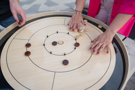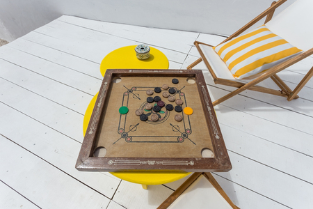 Carrom board game, A game of carrom with pieces carrom man on the board carrom