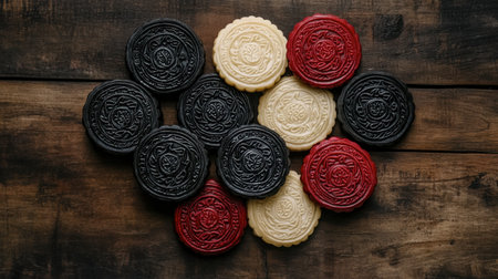 A visually appealing arrangement of decorative cookies in red, black, and white colors set on a wooden surface. Perfect for celebrations or gourmet displays.
