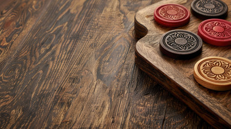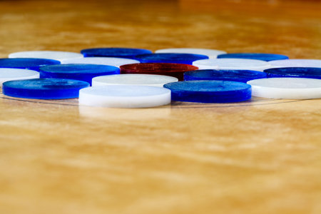 Carrom board with red, blue, and white coins neatly arranged in the center circle, highlighting an indoor leisure game with colorful elements for a strategic tabletop experience.
