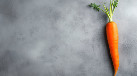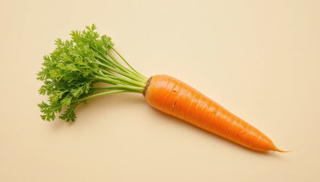 A vibrant orange carrot with fresh green leaves rests on a neutral background. Highlighting its organic shape, this carrot represents healthy produce often found in gardens or markets.