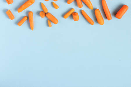 Frozen vegetables such as baby carrots arranged at the top edge on a blue background with copy space. Top view. Horizontal orientation