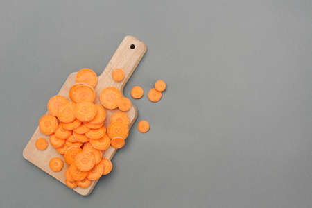 Slices of fresh carrots on a wooden board on a gray background.