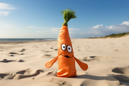 a carrot with a tan line in the shape of a bandana on a sandy beach, created with generative ai